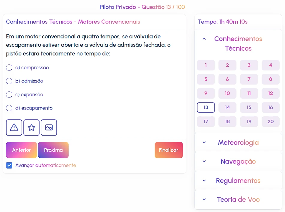 Oferecemos questões 100% baseadas nos exames oficiais da ANAC, com explicações detalhadas e recursos visuais.
